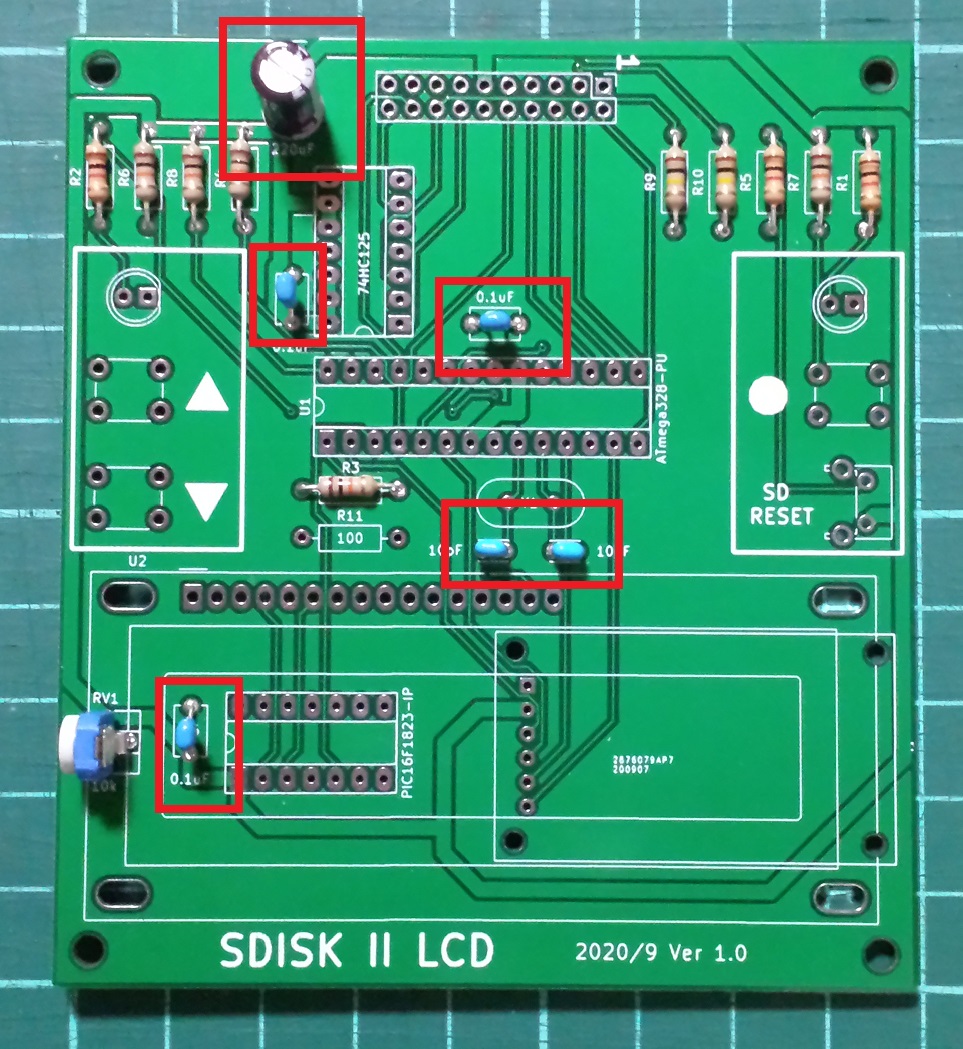 1.下の写真のようにコンデンサーをはんだ付けします。