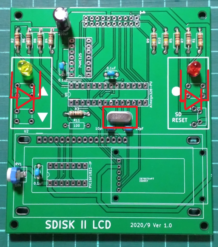1.下の写真のようにLED、クリスタルをはんだ付けします。