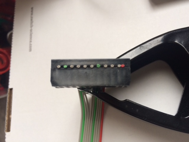 フラットケーブルの1本目(赤線)と2本目はくっけて、2本目と3本目は